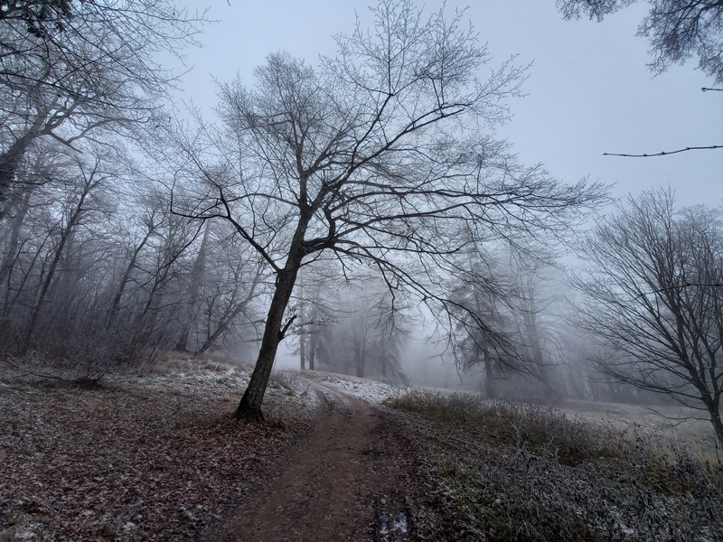 Fog sets in and the leaves begin to fall slowly.