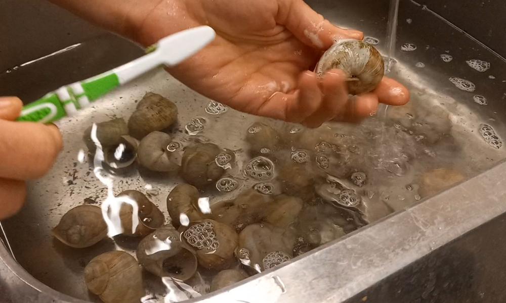 A snail shell picked up from the forest floor is usually quite dirty. You'll find soil, plant debris, and maybe even the remains of its former inhabitant. That’s why the first step is: into the water it goes.