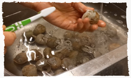 First, I give the shells a rough cleaning in the garden, then it's off to the sink. They get a thorough scrub with an old toothbrush and some of my mom's handmade natural soap.