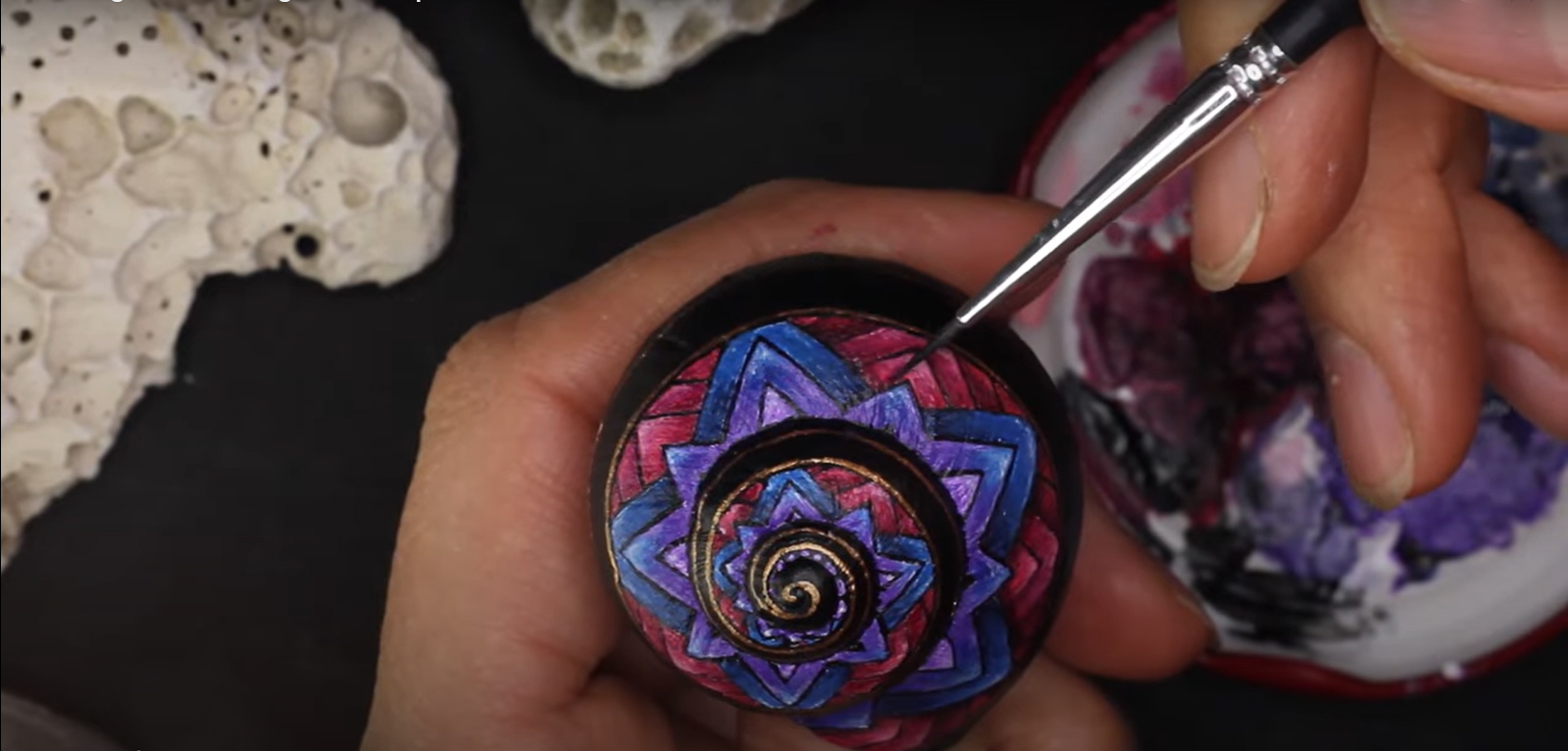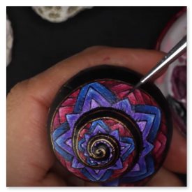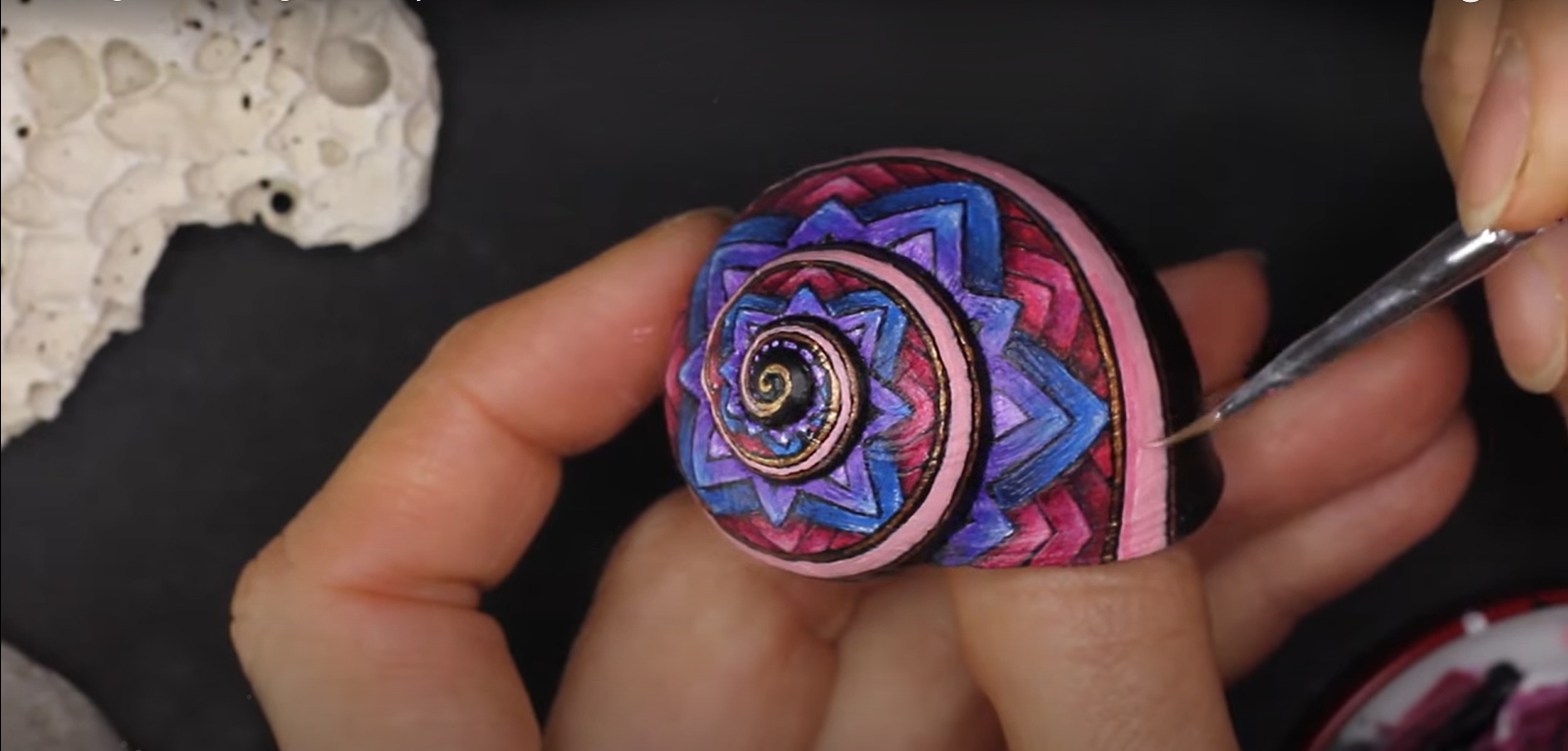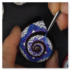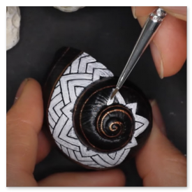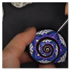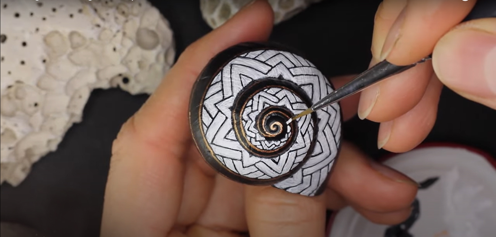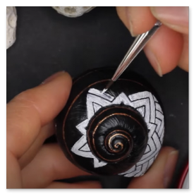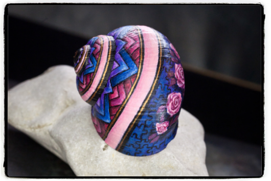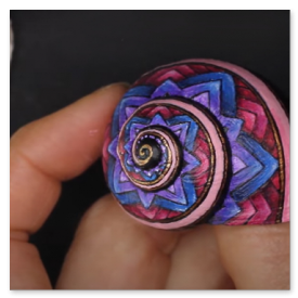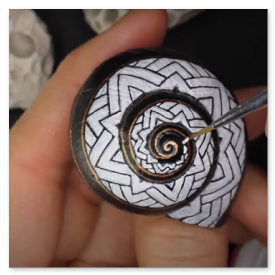 Nachdem dieses nette kleine Muster meinen Weg im world wide web gekreuzt hat, musste ich es natürlich in der wohlbekannten Form - gemeint ist die Spiralform - auf die kleinstmögliche Leinwand bannen. Gut, ich habe versucht, ein halbwegs geräumiges Schneckenhaus zu verwenden. Also eines, das etwa 5mm größter ist, als der Durchschnitt, mehr war nicht herauszuholen. Nichtsdestodennoch - das Muster musste exakt gemalt werden, andernfalls würde es seine Wirkung nicht entfalten, so dachte ich mir... und machte mich mit größter Geduld an die Arbeit. Zu diesem Werk gibt es ein interessantes Makingof auf meinem youtube-Kanal zu sehen, Link siehe unten.