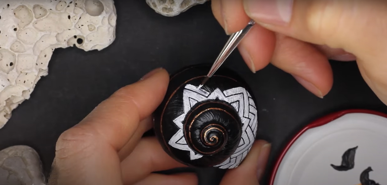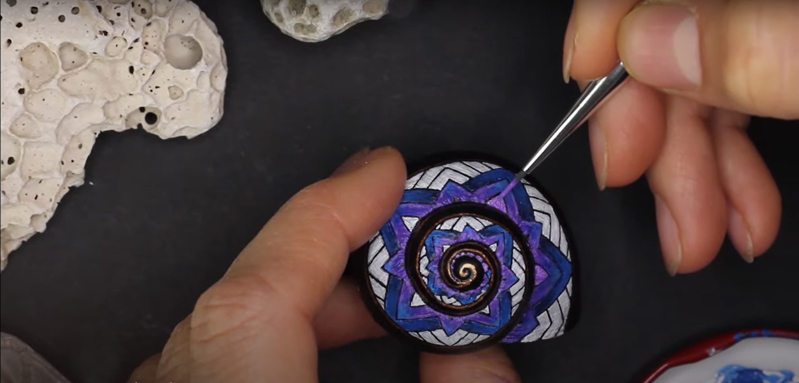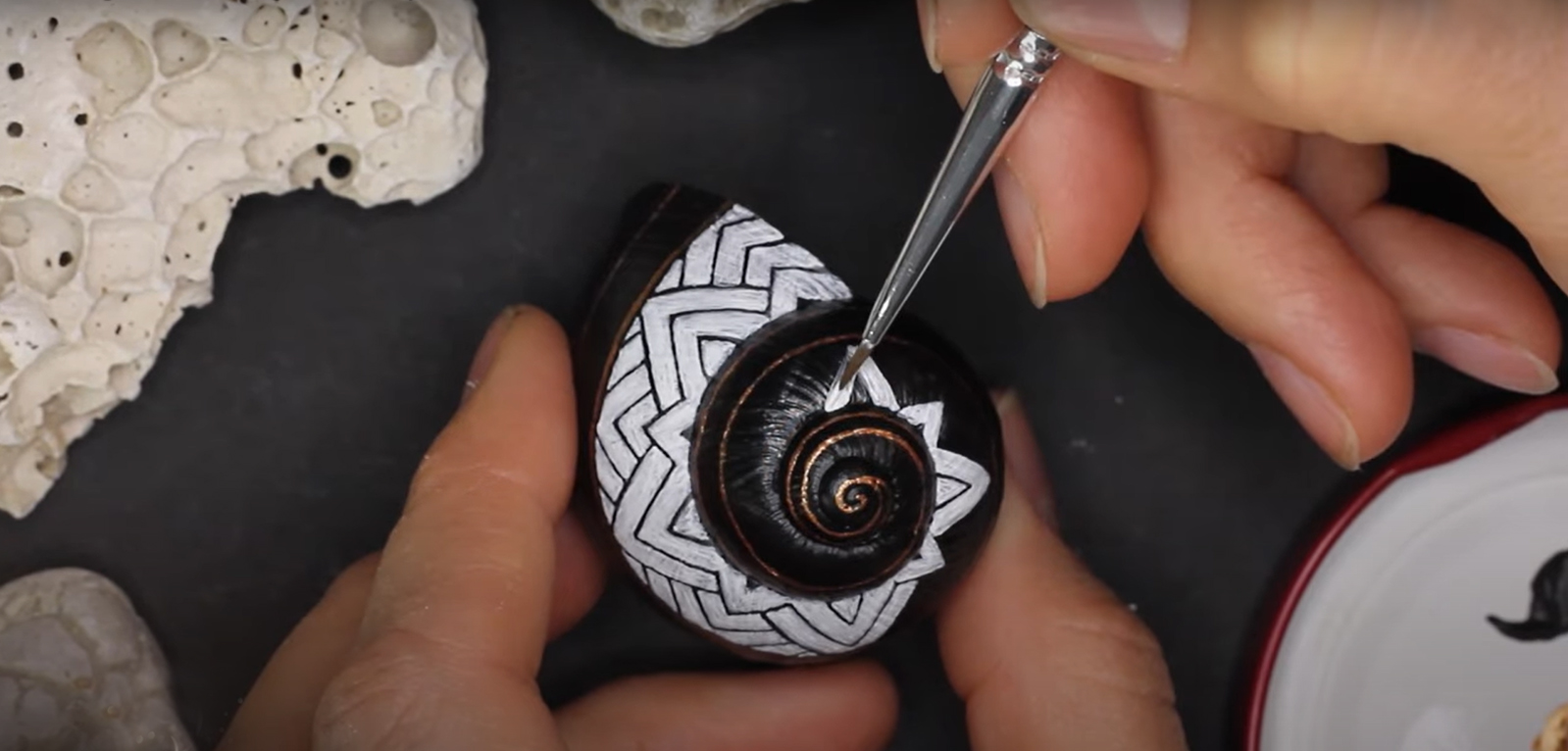 Nachdem dieses nette kleine Muster meinen Weg im world wide web gekreuzt hat, musste ich es natürlich in der wohlbekannten Form - gemeint ist die Spiralform - auf die kleinstmögliche Leinwand bannen. Gut, ich habe versucht, ein halbwegs geräumiges Schneckenhaus zu verwenden. Also eines, das etwa 5mm größter ist, als der Durchschnitt, mehr war nicht herauszuholen. Nichtsdestodennoch - das Muster musste exakt gemalt werden, andernfalls würde es seine Wirkung nicht entfalten, so dachte ich mir... und machte mich mit größter Geduld an die Arbeit. Zu diesem Werk gibt es ein interessantes Makingof auf meinem youtube-Kanal zu sehen, Link siehe unten.